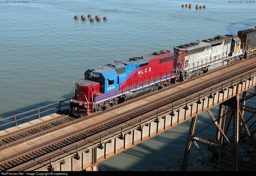 On 10.26.03, GP38-2 HLCX3810 leads the MSJRV26 north (RR east) across the Benecia Carquinez trestle. Trailing in the consist is a Colton based fading and patched SP SD40M-2 in UP2733.
