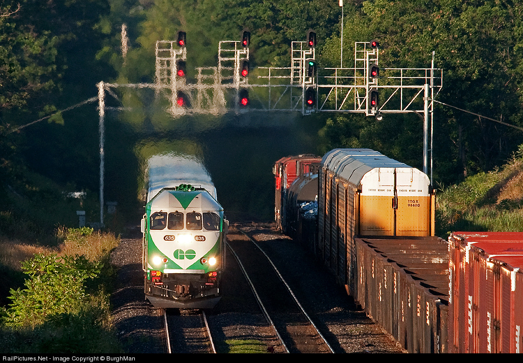 GO Eastbound 494 passes under the signal bridge at SNAKE a CN Westbound 421 departs on a Medium-To-Clear signal. (I think!) I'm still learning the Canadian aspects.