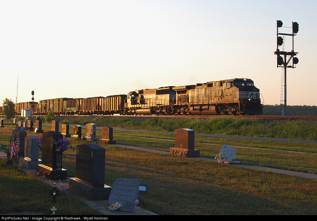 Eastbound coke loads storm into Miller City shortly after sunrise, passing the town cemetery and a classic NKP bracket mast.