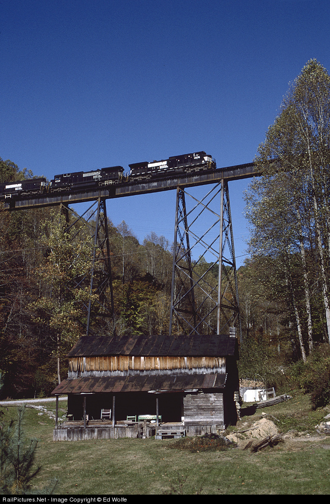 NS Q45 rolls across Big Lawson Trestle along Bull Run between Coeburn and St. Paul. The Lawson homestead, one of the oldest in Wise County, and now hidden behind a newly built structure, is located below.