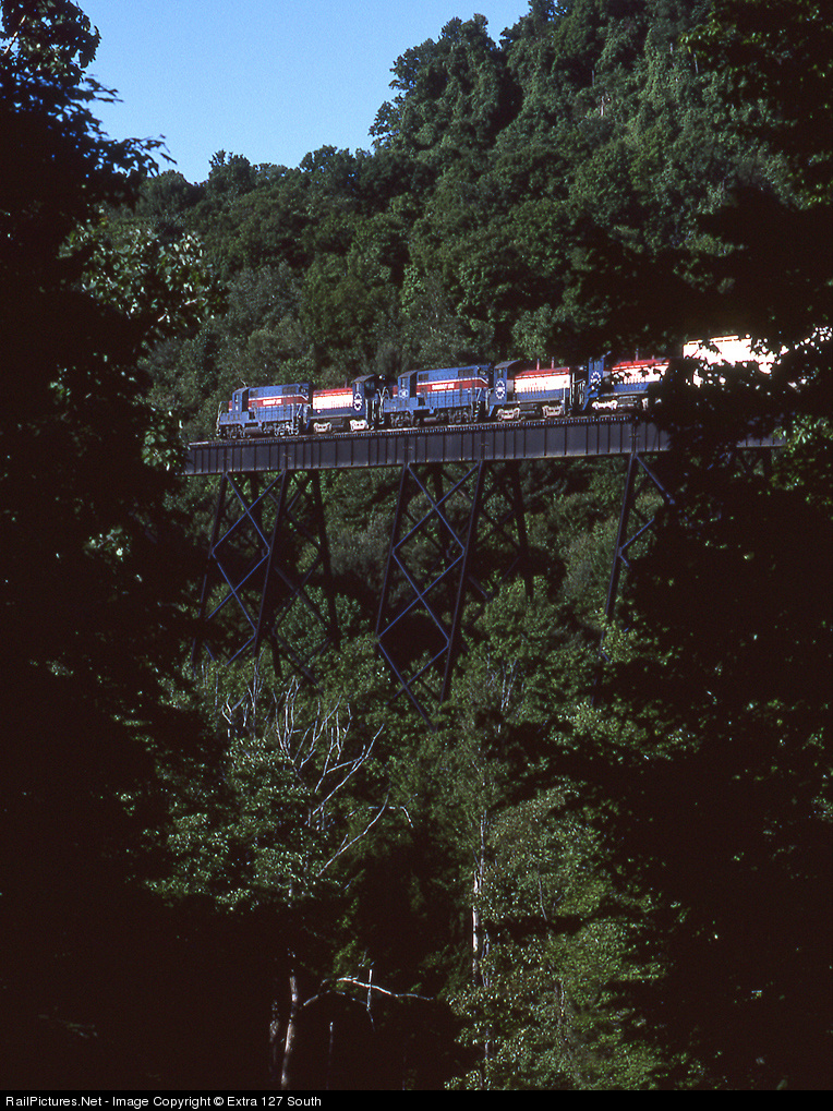 One thing I always loved about the P&S was the trestles. They were beautiful and very well maintained. Unfortunately, it seemed every time a train was approaching, it would be cloudy. If the train was going away, the sun shined. Such was the case on June 6, 1991 as southbound BVL-1 (Brookville Local) passed high above the valley on the East Branch Viaduct under sunny skies. Power for the day was GP7s No's 11 and 10 and SW9s No's. 1866, 1816, and 1775.