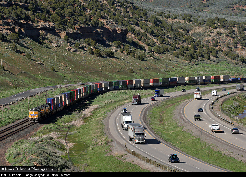 On a beautiful springtime afternoon in Echo Canyon, Union Pacific's colorful Global One, IL to Los Angeles, CA stack train rambles west along the rubber tired competition on parallel I-80.