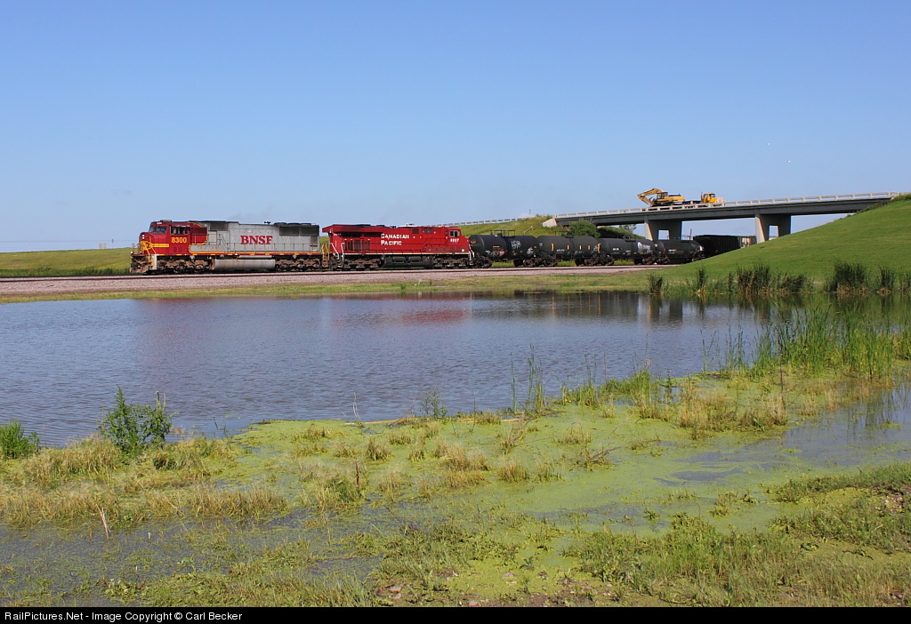 BNSF 8300 and CP 8837 lead the Noyes to Dilworth manifest southward under the overpass and past the pond at Alton.