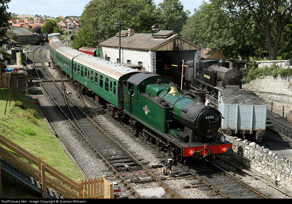 | Great Eestern 0-6-2 tank loco no 6695 passes the engine shed at Swanage as it nears the end of its journey on the Swanage Railway. On the turntable is Southern Railway M7 no 53. |