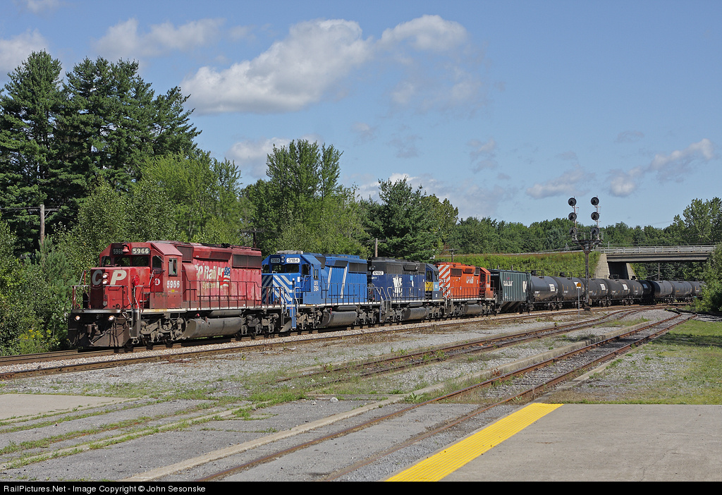 Another crazy CP lashup leads the 642 loaded ethanol thru the Saratoga passenger station on its way to Kenwood Yard, Port of Albany with 81 loads. Trailing units are CEFX SD40-2 #3184 (ex BN 7093), ICE SD40-3 #6102 in patched IMRL paint (ex UP 3060, IMRL 208, ICE 208), CP SD40-2 # 5906.