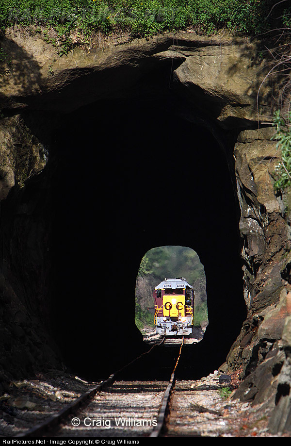 | Southbound empty coal train with 54 cars and power on both ends is about to enter the natural tunnel near Rehobeth. This train runs between the power plant at Conesville, OH, and mines located at Rehobeth or Burr Oak. Today's train has the Ohio Central's 4023/4025 on the head end, and 4029 on the rear end. |
