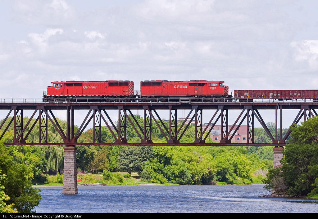 | I heard the CP 9001 getting the railroad west out of Guelph Junction so I decided to shoot him crossing the Grand River. Imagine my surprise when he started onto the bridge with not one, but two SD40-2F's! |