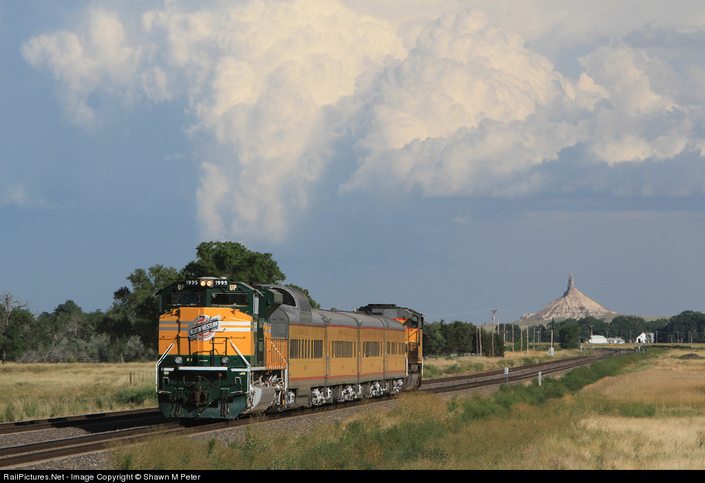 UP 1995 trails the push pull Life Saver Special visiting Gering, NE traveling passed Chimney Rock.