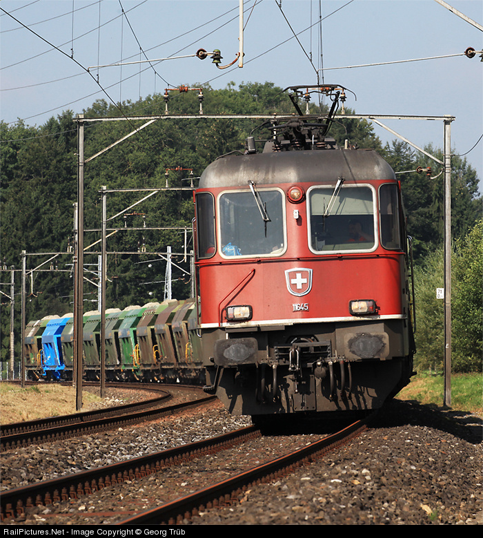 | Re 6/6 11645 (Bo'Bo'Bo', 10600 HP) is pulling gravel train 67871 with 20 cars and 1567 tons from Hüntwangen via Bülach-Winterthur-Romanshorn VL (joining line) to Rorschach, then in two parts up to the concrete work MOAG between Goldach and Mörschwil. |