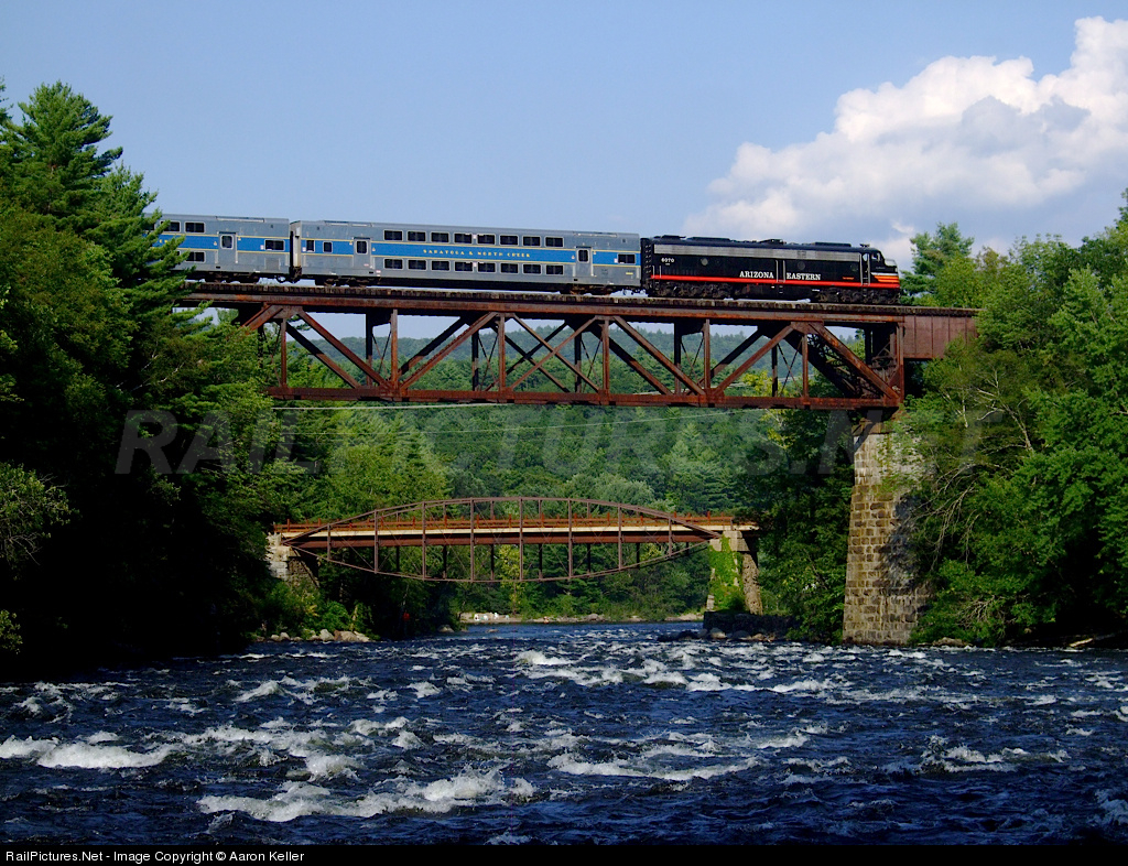 MAIDEN RUNS: New Power in the Adirondacks. This former Arizona Eastern E8 is now working passenger trains on the new Saratoga & North Creek Railway. Aug. 18th was its first day in service. Here, the locomotive hauls passengers across the Sacandaga River. The impressive railroad trestle, the third on this site, was built in 1943 by the Delaware & Hudson to accommodate heavy titanium and magnetite ore trains from Tahawus. (Modern era mining in Tahawus began in the 1940s and ended in 1989.) The railroad bridge is five spans long, and its total length is just a few inches greater than 516 feet. The "bow bridge" visible below the railroad trestle is even more interesting. The developer that helped rebuild it a few years ago states that it is the only remaining "half-deck" lenticular truss bridge of the two or three ever built. ("Half-deck" because the road sits in the middle of the parabolic "bows.") The "bow bridge" dates back to 1885; the abutments upon which it sits were from an earlier wooden covered bridge that went up in 1813 — well before the railroad. The "bow bridge" is now on the National Register of Historic Places. Digital Photo.