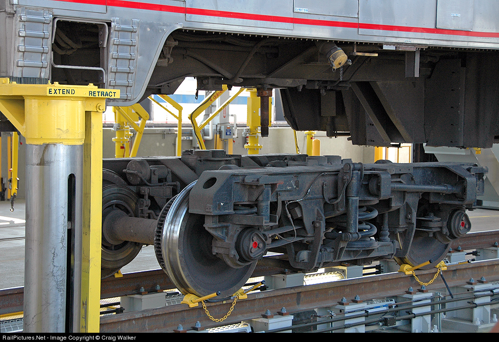 Amtrak "Superliner" coach 34008 has had its body raised by one of the two sets of permanent car jacks at the new Preventive Maintenance Facility at the carrier's Los Angeles engine and car shops. With the body removed, the trucks can be inspected, cleaned and, if necessary, replaced. The four hydraulic jacks lift the body in a matter of seconds. One of the car's two kingpins, which pass through the trucks' bolsters, can be seen in this view, as well as the chocks holding the trucks in place for reassembly. The car body's four jacking pads are just outboard of the corner steps. For other views from this operation, click HERE and HERE. Photographed on railroad property with permission and full PPE.