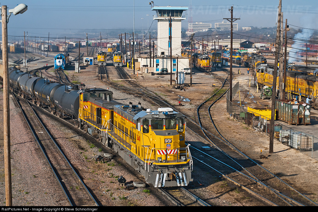 | The shop and switching terminals are busy on this late winter morning, with new genset No. UPY 2640 pulling a string of cars out of the yard's east end. |