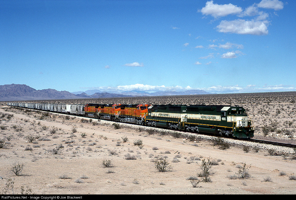 this is one railroad you have to want to photograph as it traverses some very unforgiving and desolate territory across the Mojave desert of So California on it's west end. This is a unit runthrough cement train that normally runs at night with just BNSF power opposite the daily A&C freight run but today with little interchange from the BNSF the job left the interchange at Cadiz, CA and coupled to the cement train and took it back to Parker and eventually Phoenix, AZ