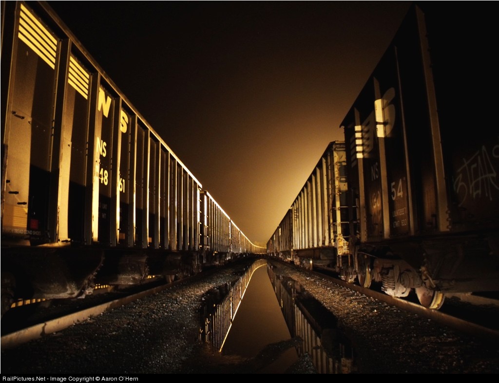 | Heavy thunderstorms brought major flooding to SWPA and Shire Oaks yard was not exception, the roads through the yard were turned into small rivers. Using the yard lights and lights on the truck I framed up two hopper trains waiting to go south into the coalfields |