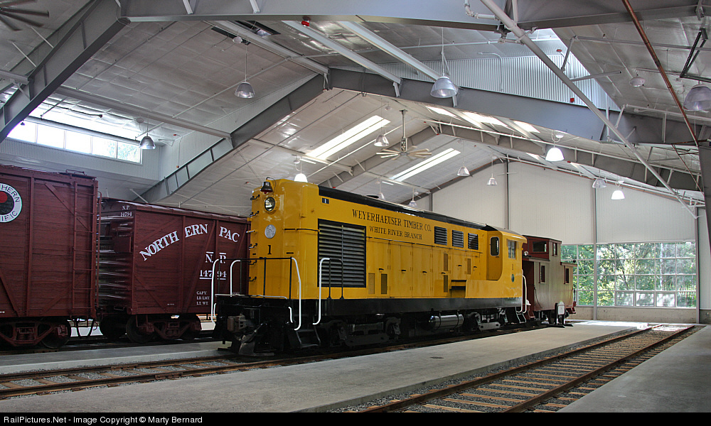 Weyerhaeuser Timber Co. #1, just painted and lettered, sits in the Museum's new Display Building with a handful of other artifacts. The track work inside and outside the building is nearing completion. The climate controlled building will be dedicated this fall.