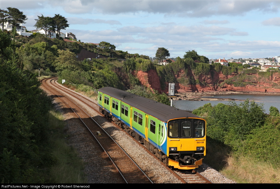 | Recently transferred from London Midland to First Great Western, 150108 passes Hollicombe Cove working 2T22 15:53 Exmouth to Paignton on Tuesday 16th August 2011 |