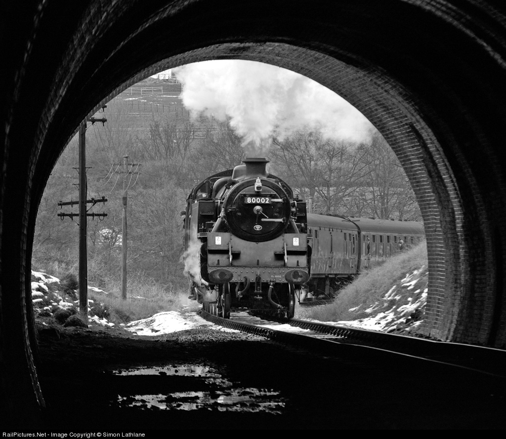 BR Standard Class 4 No 80002 enters Mytholmes tunnel on the KWVR with snow still on the ground.