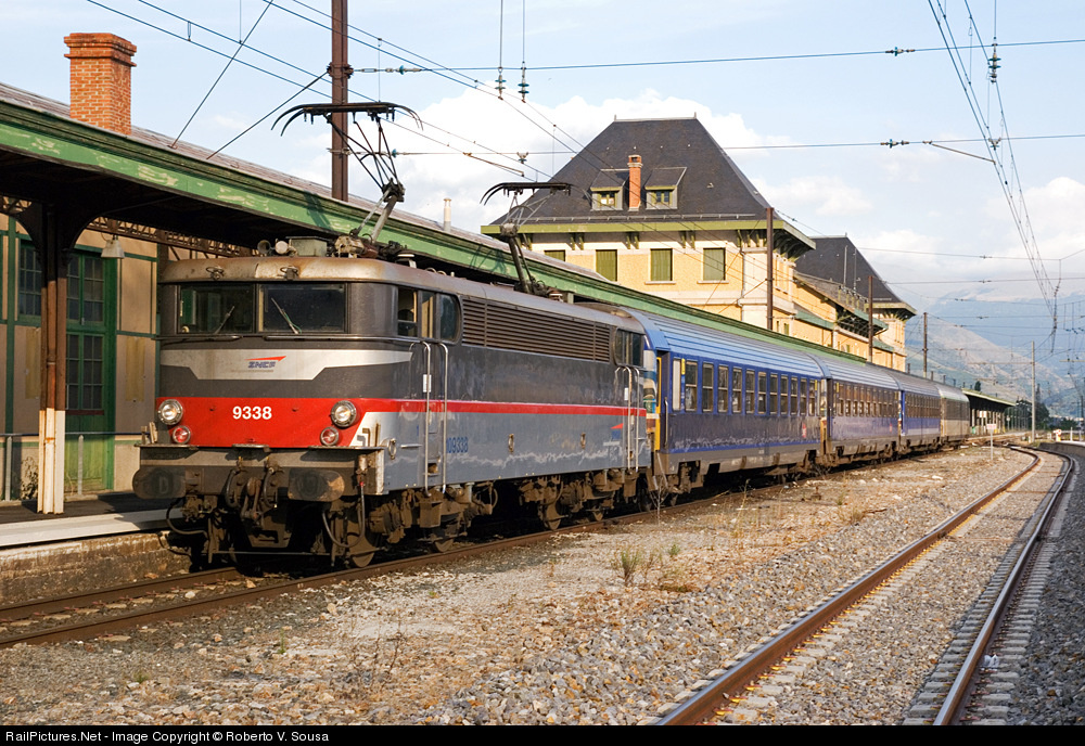| SNCF 9338 with a Corail Lunéa train (Latour de Carol-Enveitg to Paris Austerlitz) in Latour de Carol-Enveitg station.