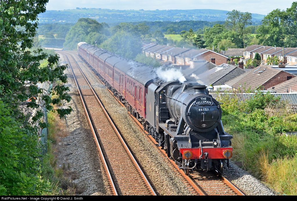 | Sir William Stanier designed these locomotives for heavy freight work,although it was not unusual to see them on passenger duties.Here is preserved loco 48151 heading "The Fellsman" railtour from Lancaster to Carlisle.The train is seen here approaching Clitheroe station,in Lancashire,on a (rare) bright August day. |