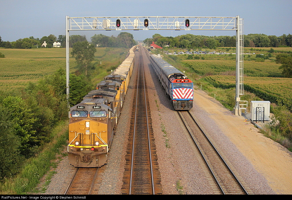 UP 6461 passes Metra 171 as it climbs the hill west of the La Fox station.