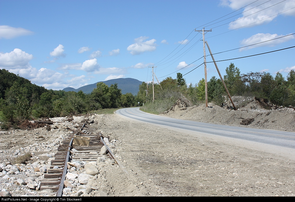HURRICANE/TROPICAL STORM IRENE DAMAGE IN VERMONT: The State of Vermont was absolutely devastated by Hurricane/Tropical Storm Irene. This scene along Vermont Railway's Bennington and Rutland Subdivision at Manchester, Vermont is minor compared to other damage throughout the state. Nevertheless, this will certainly put this line out of service for a while. Here, water crossed the road on the right and swept over the tracks.