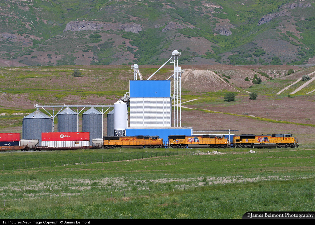 | A trio of EMD motors lead Union Pacific's Salt Lake City, UT to Long Beach, CA intermodal west along the colorful grain elevator at East Erda. |