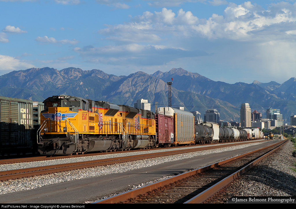 | A pair of late model EMD SD70ACe units shove Union Pacific's North Platte, NE to West Colton, CA manifest west through North Yard in Salt Lake City. |