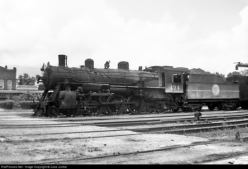 Atlantic Coast Line 4-6-2 434 was one of 45 P-3 Class locomotives built in 1914 by the Baldwin Locomotive Works. She had 69" drivers, 22 x 28 inch cylinders, boiler pressure of 200 lbs, and produced 33,389 lbs of tractive effort. This image from my collection was captured at St. Petersburg, Florida shortly before ACL 434 was retired.
