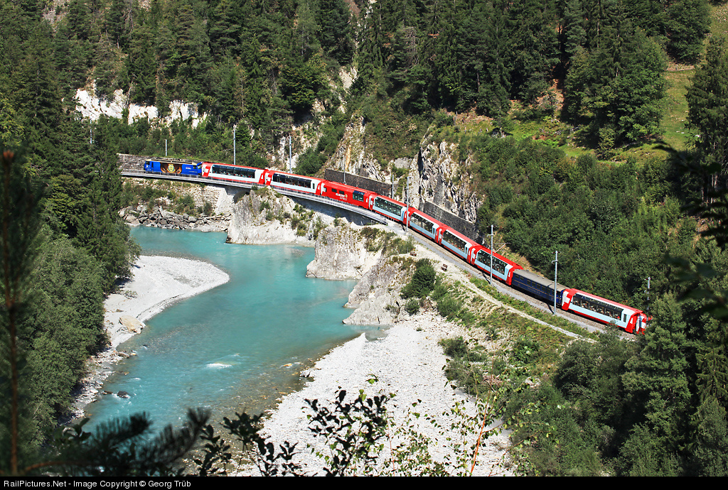 | World famous "Glacier Express" with cars from St.Moritz and Davos to Zermatt is rounding the tight curve below the ruins of Wackenau castle in the gorge of the Vorderrhein between Reichenau and Trin. In Disentis the train will be split in two parts for the further journey via Oberalp pass to Andermatt, through Furka tunnel, the Goms and Matter valley to its final destination. Pulling is the blue Ge 4/4 III 652 in promotion livery for HCD (Hockey Club Davos). |