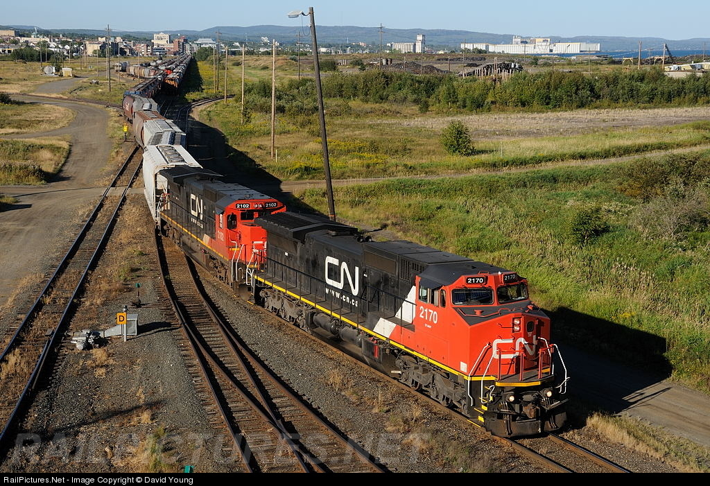 | Two of CN's new aquistions, CN 2170 and CN 2102 (former BNSF and UP locomotives respectively) switch grain in Port Arthur yard. This past August has been seen higher than normal amounts of grain coming into the port of Thunder Bay, as seen by the full yard in the background. |