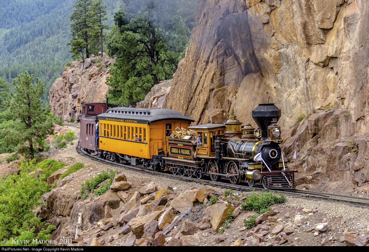 Eureka on the shelf. With former D&S Engineer Monty Caudle on the throttle, Eureka & Palisade #4 hauls her passenger extra across the rock shelf above Elbert Creek toward nearby Rockwood Station. When folks look at the present day pictures of Eureka, one of the most commonly asked questions is why her trains are so short. The answer is actually pretty straightforward. Although much of the rolling stock on the D&S dates back to the late 1800s, both the original construction and the modifications made over the years have made them considerably heavier than what Eureka hauled back when she was new. The wooden cars you see in this photo have more iron and steel in them than did the cars of the 1870s. As a result, the locomotive is limited on the steeper grades of the Colorado NG to about what is pictured. On flatter terrain, the train could be lengthened by a car or two. Owner Dan Markoff is actually in the process of building a "period" E&P Combine that could be displayed and even run with Eureka, but alas, the construction methods that he must use to make the car authentic will probably not be strong enough to meet current safety standards on FRA-regulated lines such as the D&S, thus the car will probably be restricted from carrying passengers.