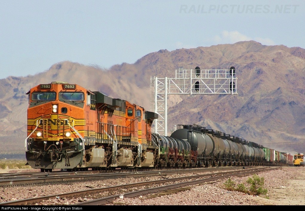 | A trio of BNSF GEs, led by ES44DC 7692 roll through Cadiz with a westbound manifest. Normally trains fly through Cadiz, but on this sunny October afternoon there is a slow order in affect due to track work. |