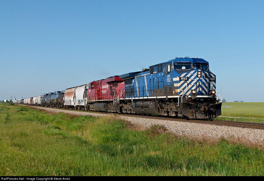 CEFX 1053 and CP 8795 lead a southbound manifest through Crossfield.