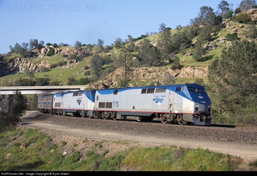| Looking right at home in the green Tehachapi hills, Amtrak's detouring Coast Starlight climbs the grade at the west (north) end of Woodford siding. Several Starlight detours (southbound #11 only) ran over Tehachapi in late March/early April, making for some interesting afternoons. |