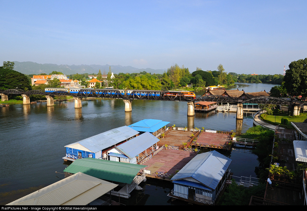 | An inbound ordinary train from Nam Tok to Thonburi, while crossing the bridge over the River Kwai, a part of the famous "Death Railway" linking Thailand and Burma. |