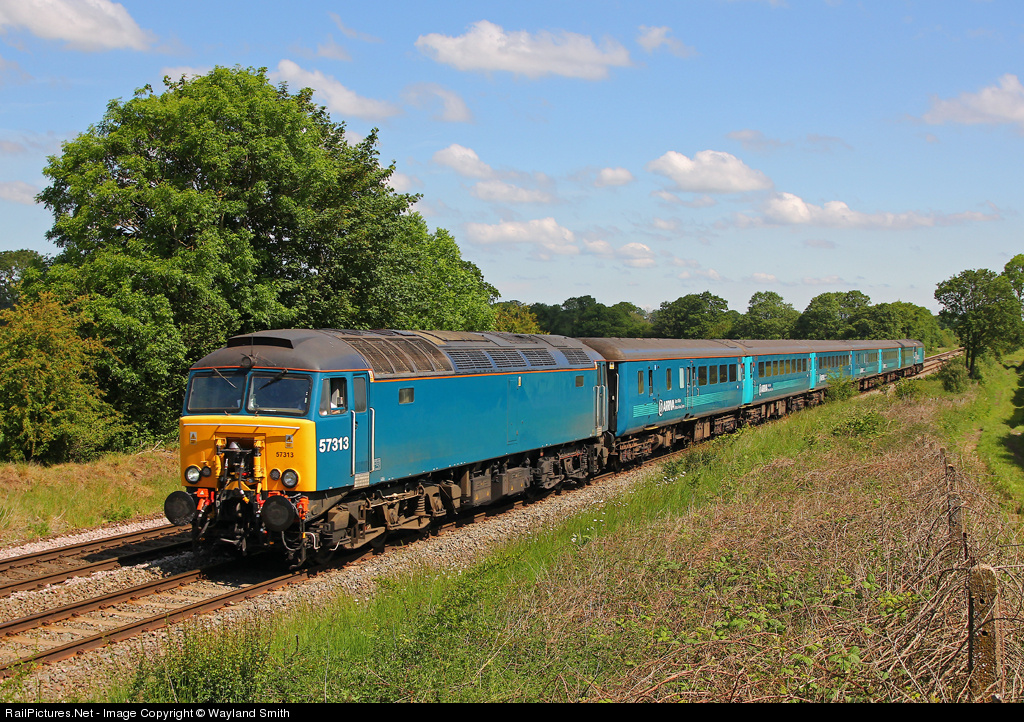 | 57313 sporting ATW livery rushes south from Prees station towards Shrewsbury with a 'Ruggex' special from Holyhead to Cardiff, as extra passengers will be travelling from all over Wales to see the national side playing Rugby at The Millennium Stadium. |