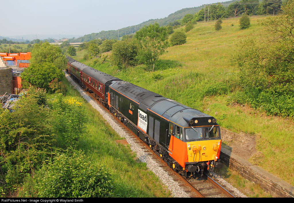 50135 'Ark Royal' seen near Irwell Vale during the East Lancashire Railway Summer 2001 Diesel Gala. The locomotive was repainted into one of the most non authentic liveries possible for Eastleigh Works Open Day in 2009. Loadhaul was one of the 3 transitional liveries applied to freight locomotives during privatisation in the late 1990s after this type had been withdrawn. Loadhaul being Trainload Freight North, a region alien to the class during the latter years of their BR working lives. The numbering from 50035 also reflects a freight locomotive which this example was not. Apart from the nameplate and crest, the only authentic feature of this engine is the fact she failed a matter of hours after this picture was taken and took no further part in the gala, a sad testimony to their troublesome record in main line traffic!