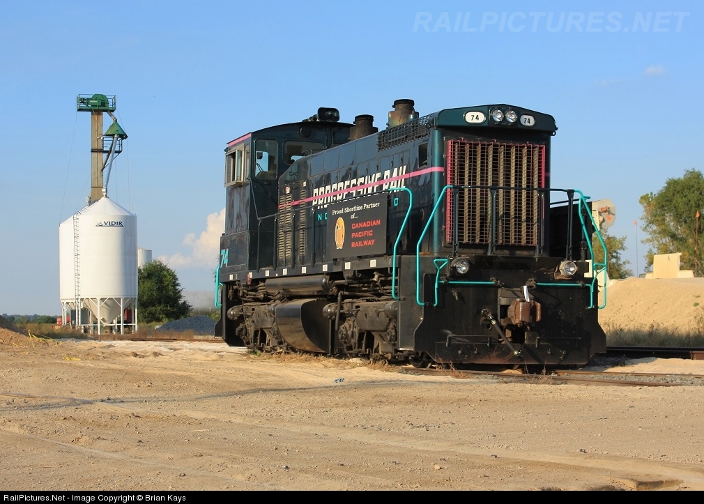 | Looking somewhat like a race car from the 80's, Progressive Rail 74 sits in Randolph over the weekend in the yard near downtown...sand strewn everywhere on the ground. |