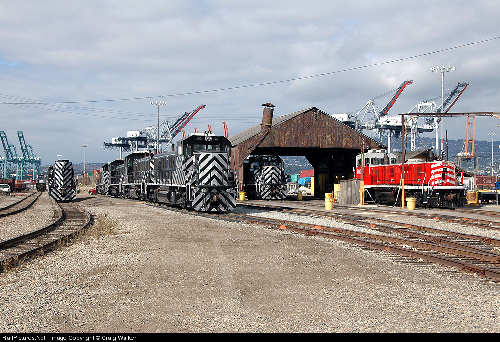 The Pacific Harbor Line rosters twenty-four engines, all low-emission diesel-electrics. In this view of the Pier A Yard enginehouse can be seen MP20C-3 66, a string of four/fifths of the roads 3GS21B units (with 30 on the near end), 3GS21C 80 in the enginehouse (half their fleet of 3GS21C diesels) and Progress Rail Services 2006, a leased PR22B, on the far right. Photographed on railroad property with permission.