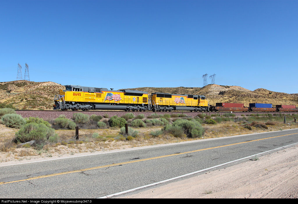 | Working up the stiff east slope of Cajon Pass, UP 8695 leads its train towards Cajon Summit where it will decend the steep 3.2% South track. |