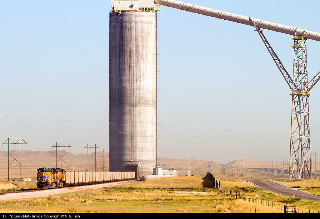 An orange cloud from blasting at Black Thunder Mine hangs in the air as a Union Pacific train loads out at Black Thunder West under the silo/flood loader.