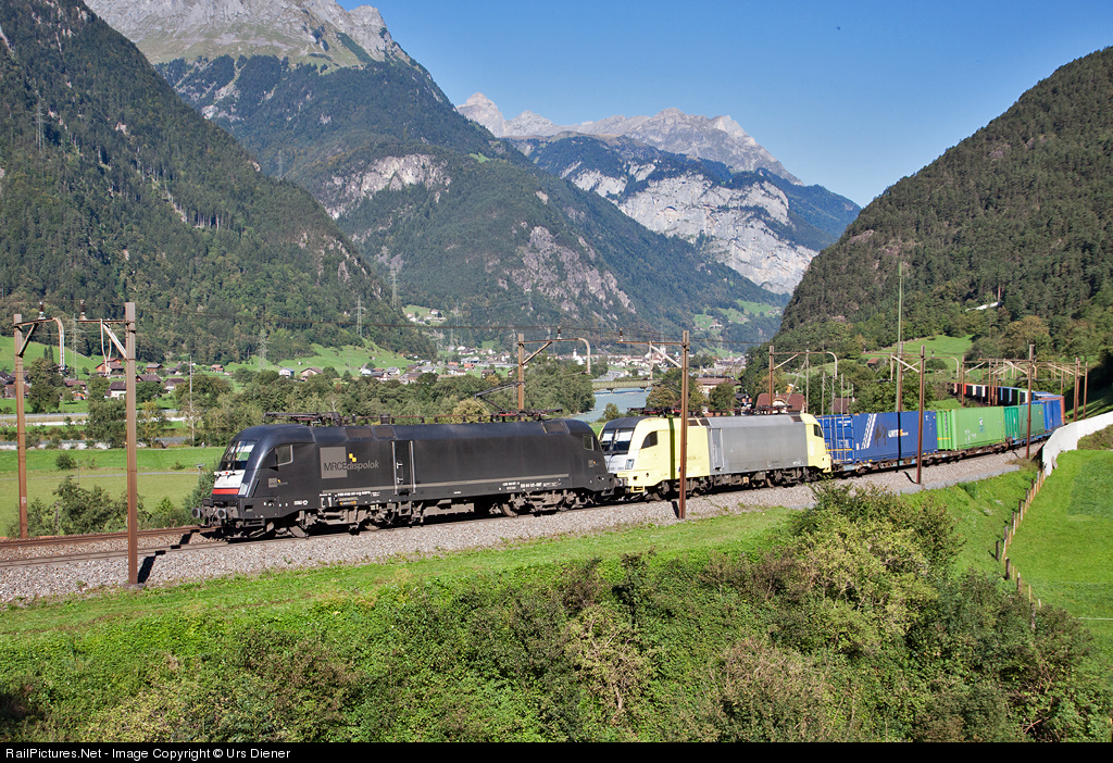 TX Logistic intermodal train with the two ES64U2 "Taurus" locomotives 097 and 095, both built by Siemens and leased from MRCE Dispolok, on the Gotthard north ramp.