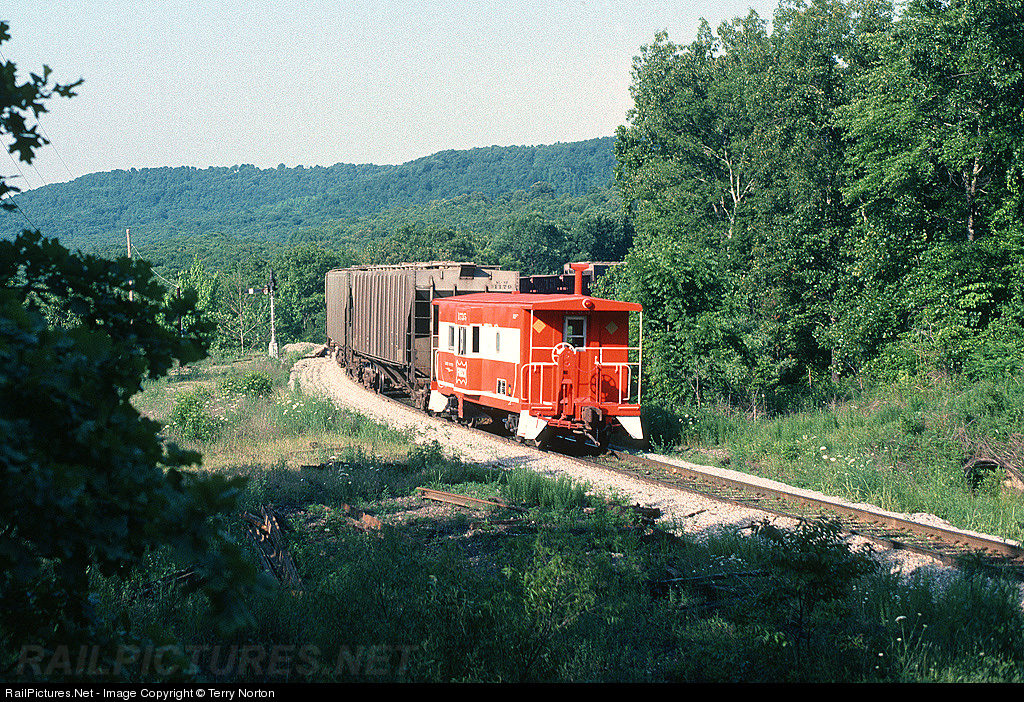A freshly painted Frisco caboose has just exited Boston Mountain tunnel at Winslow and is descending the 2.35 percent grade towards Schaberg. Note the semaphore signal to the left of the train which protected trains through the tunnel. This line survives today at the Arkansas and Missouri Railroad.