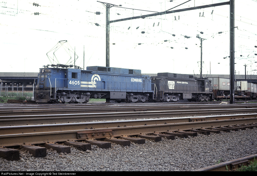Despite the relatively short period of electric operations on Conrail, some E-33 and E-44 (and one GG1) were repainted blue. Here, blue E-33 4605 leads black E-33 4607 on an eastbound piggyback train at Waverly 5 tower in Newark, NJ. During early Conrail, this location was very busy with freight activity, but Conrail soon shifted operations away from the Northeast Corridor and Waverly 5 tower, the adjacent freight yard, and the electrics were gone.