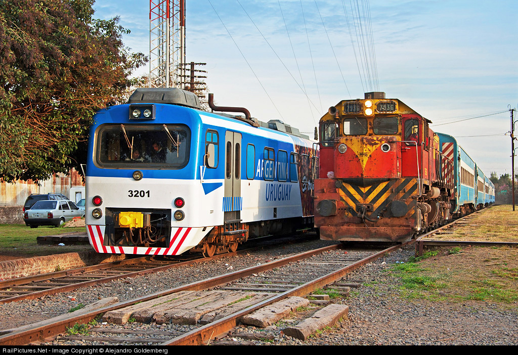 | Early in the morning Wadloper CCMM (recently acquired from Nederlandse Spoorwegen) is ready for departure to Uruguay in a test running before opening to public service, while "Gran Capitan" intercity train is passing . It came from Misiones province 5 1/2 hours delayed in a trip lasting more than 30 hours. This consist was 2 first class, 1 tourist and 2 luggage cars. |