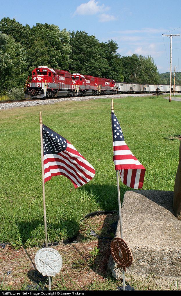 | Land of the Free, Home of the Brave. Flags for our Vietnam and Persian Gulf Vets fly in the wind at Burnside PA as the first of two coal drags which are part of the RJC-1 makes its way Eastbound to Mahaffey from Clymer PA. |
