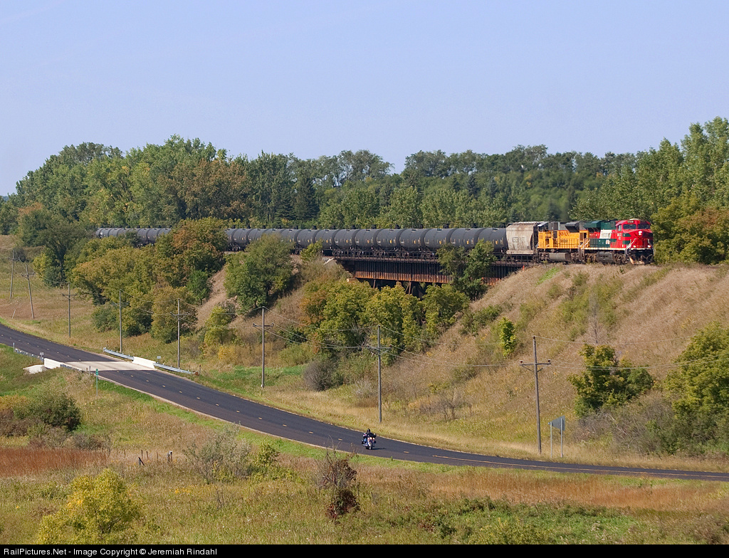 | After finishing up a 4 train meet back in town, a very rare(for the area) FXE GEVO has its crude oil train in a race against a motorcycle on the adjacent highway 55 outside of Hoffman, Minnesota. |