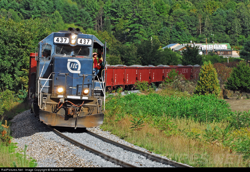 | The first northbound train on the NECR Roxbury Subdivision and over a curve that had heavily been washed out during Irene is a ballast train moving at walking speed with - ironically - a hurricane logo'd FEC GP40-3 437. Many more photos at http://steelwheelsphotography.com. |