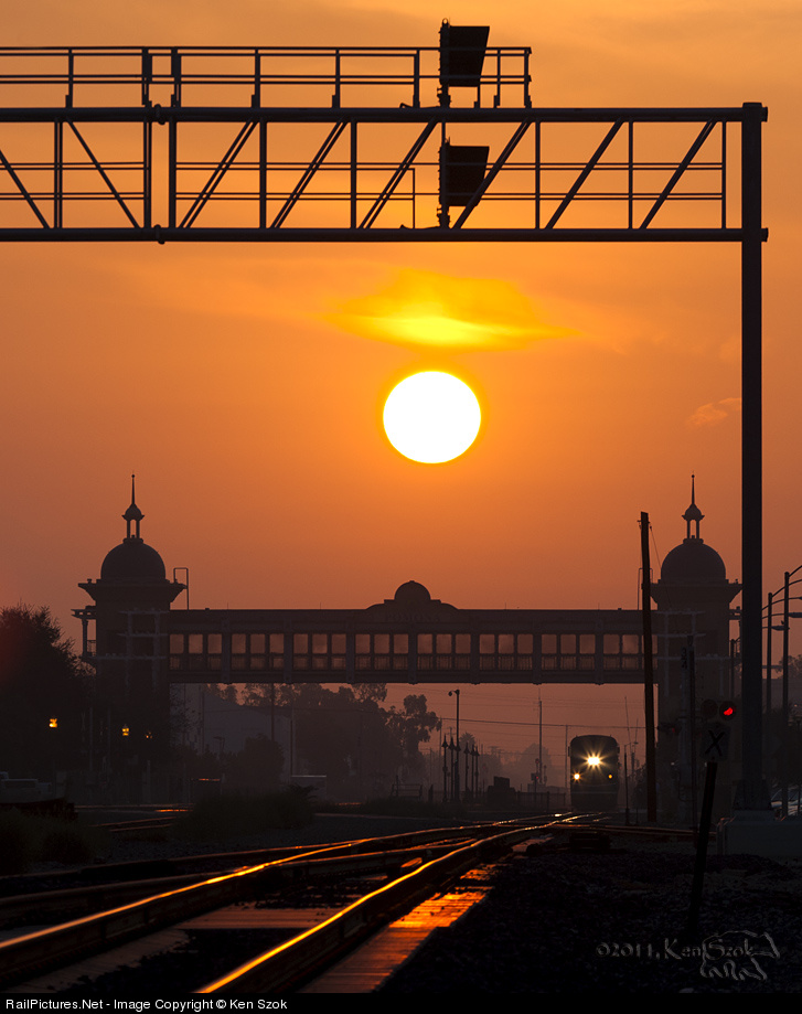 Metrolink train 405 pulls into the downtown Pomona station as the sun rises over the pedestrian bridge.