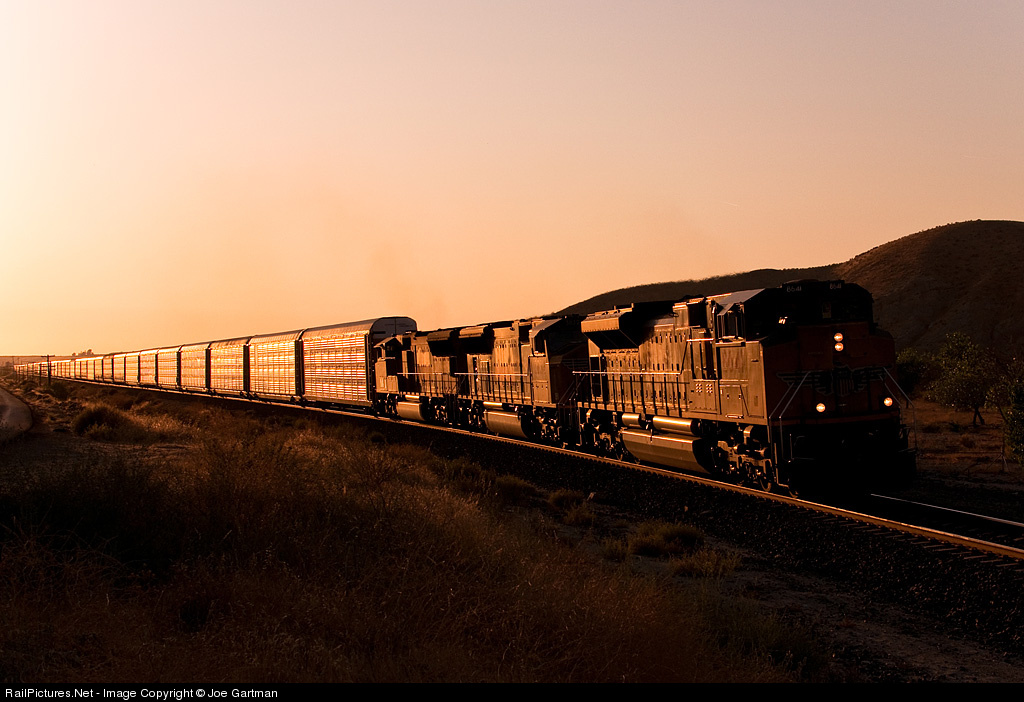 An automobile train rolls towards Ilmon as sunlight glints of its flanks.